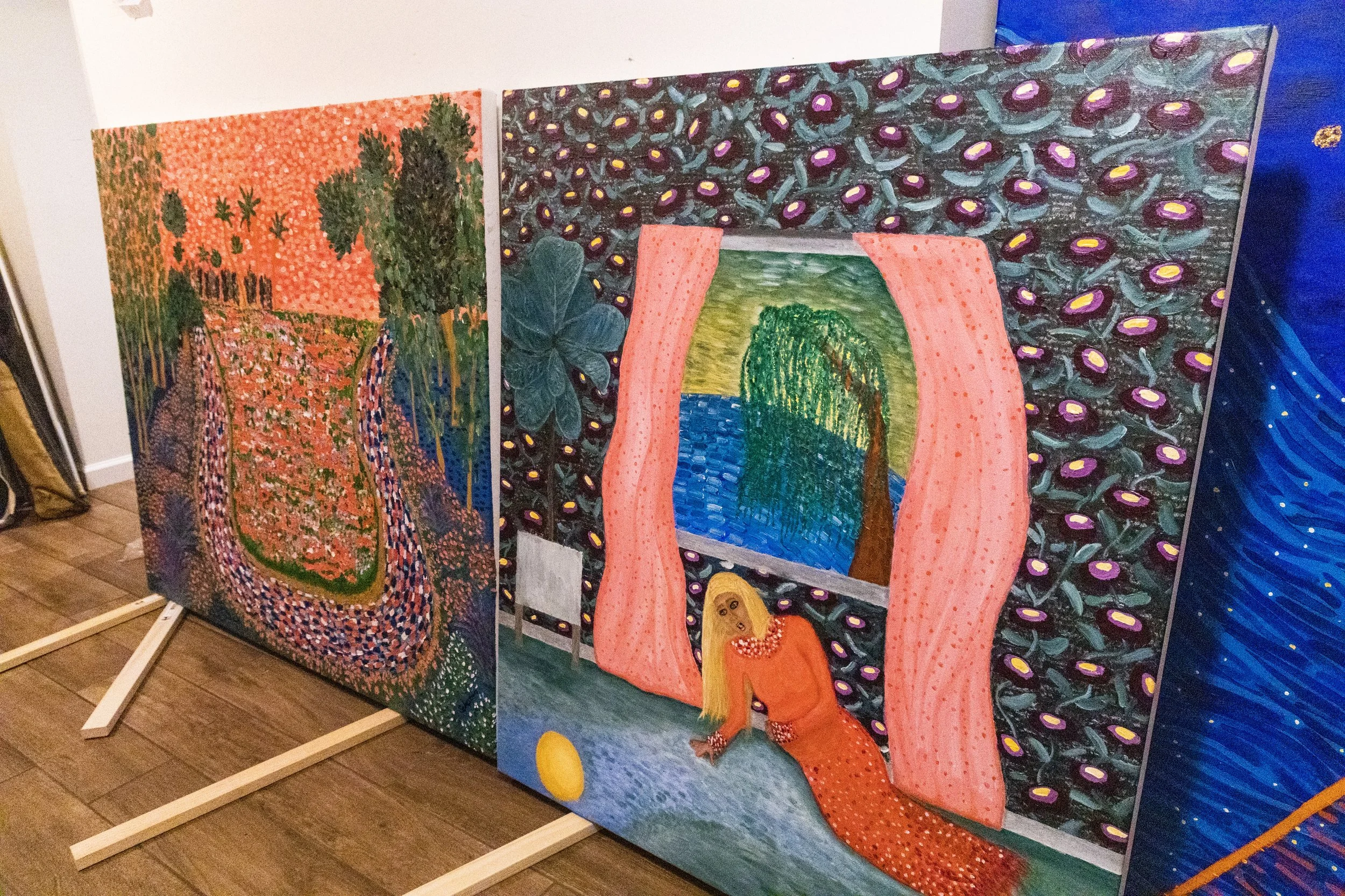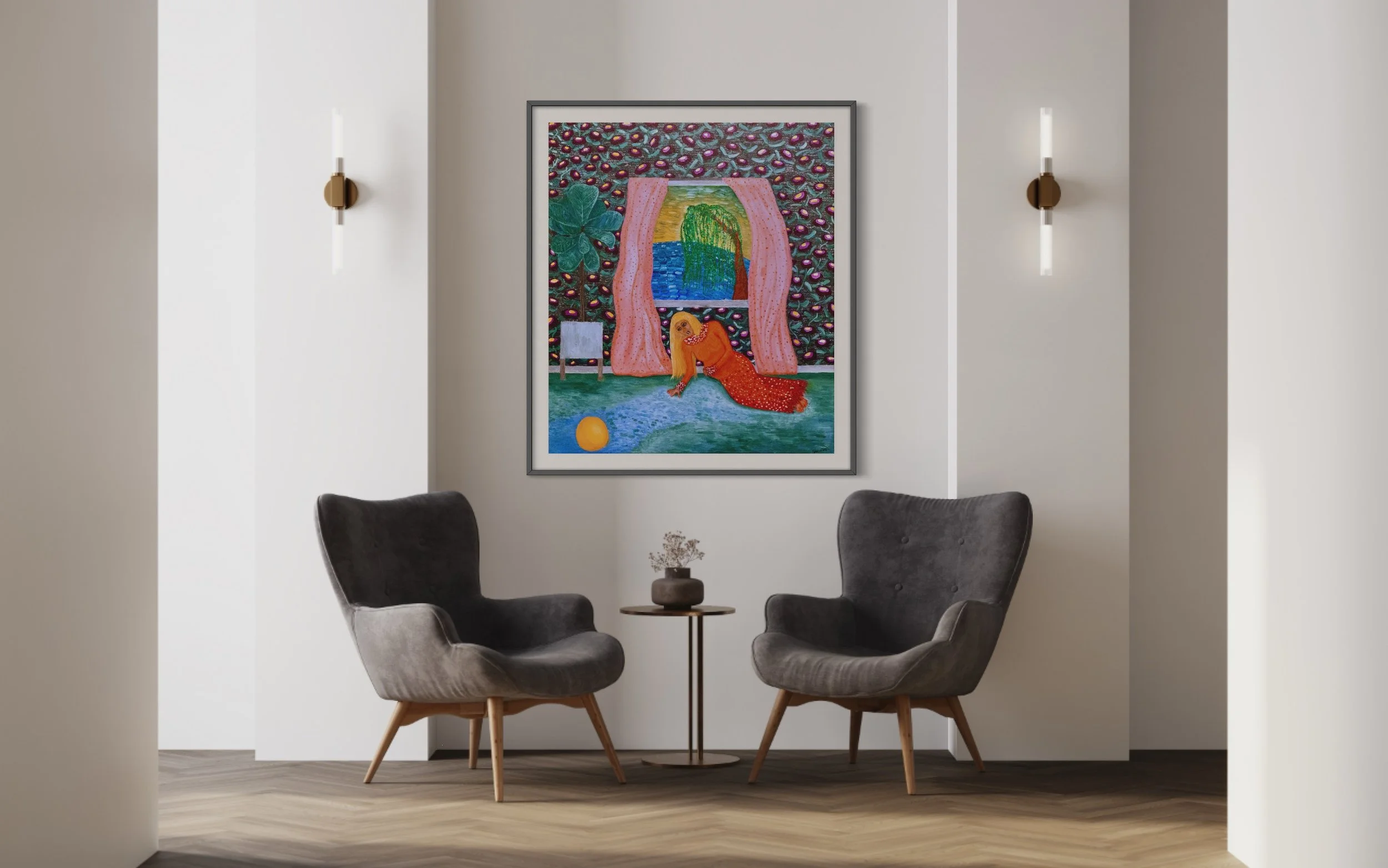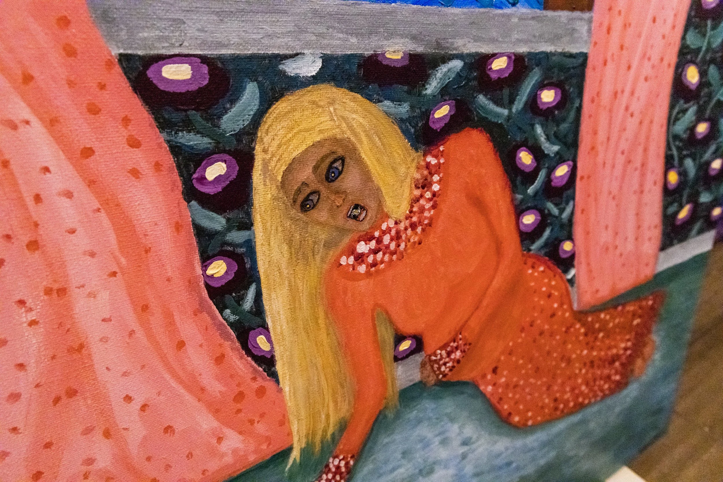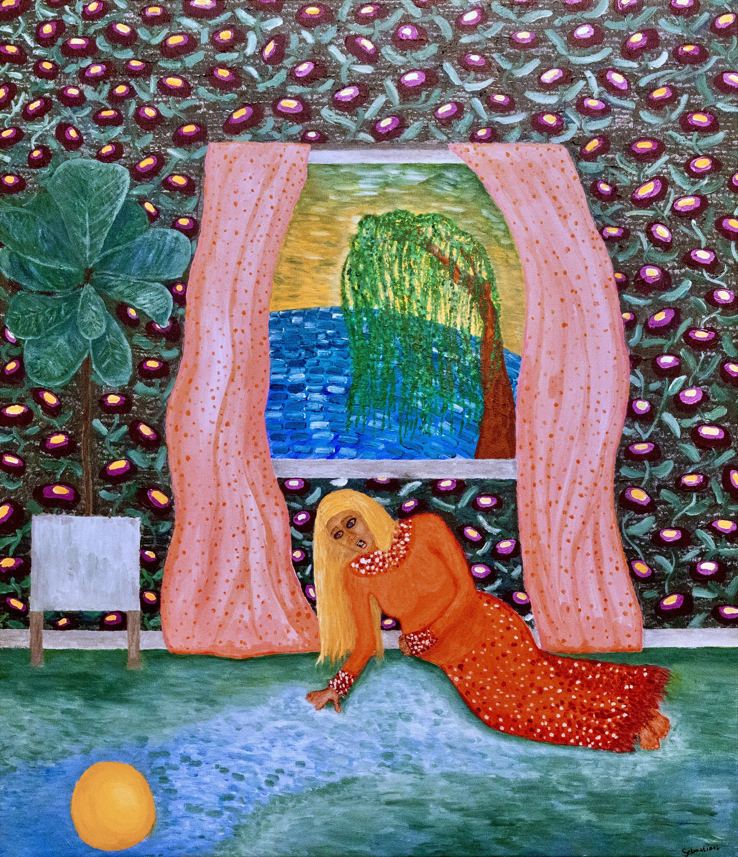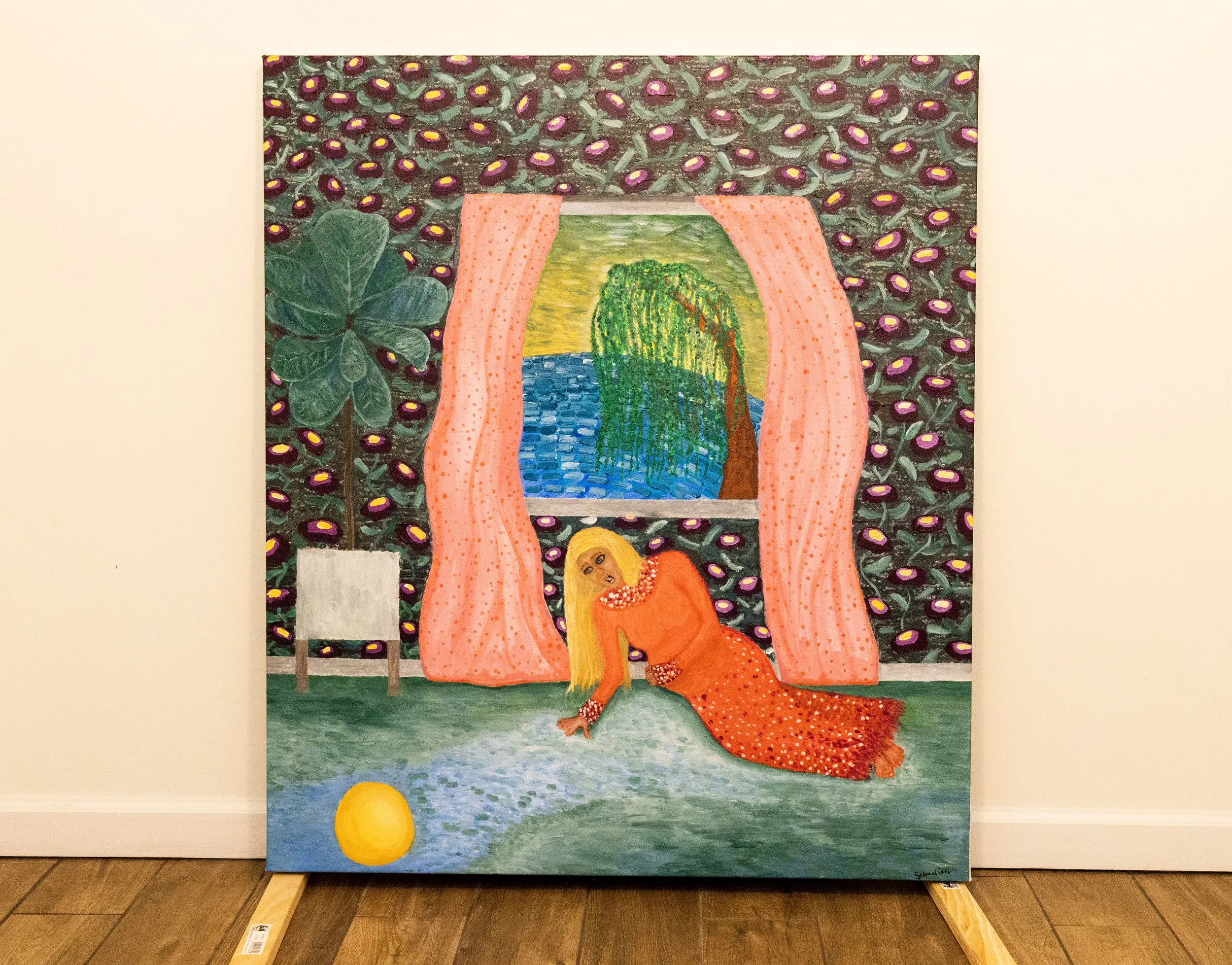 The LightA woman, holding the universe in her mouth, passes the lightScroll ↓ The Light, Acrylic on Linen, 44 inches by 38 inches